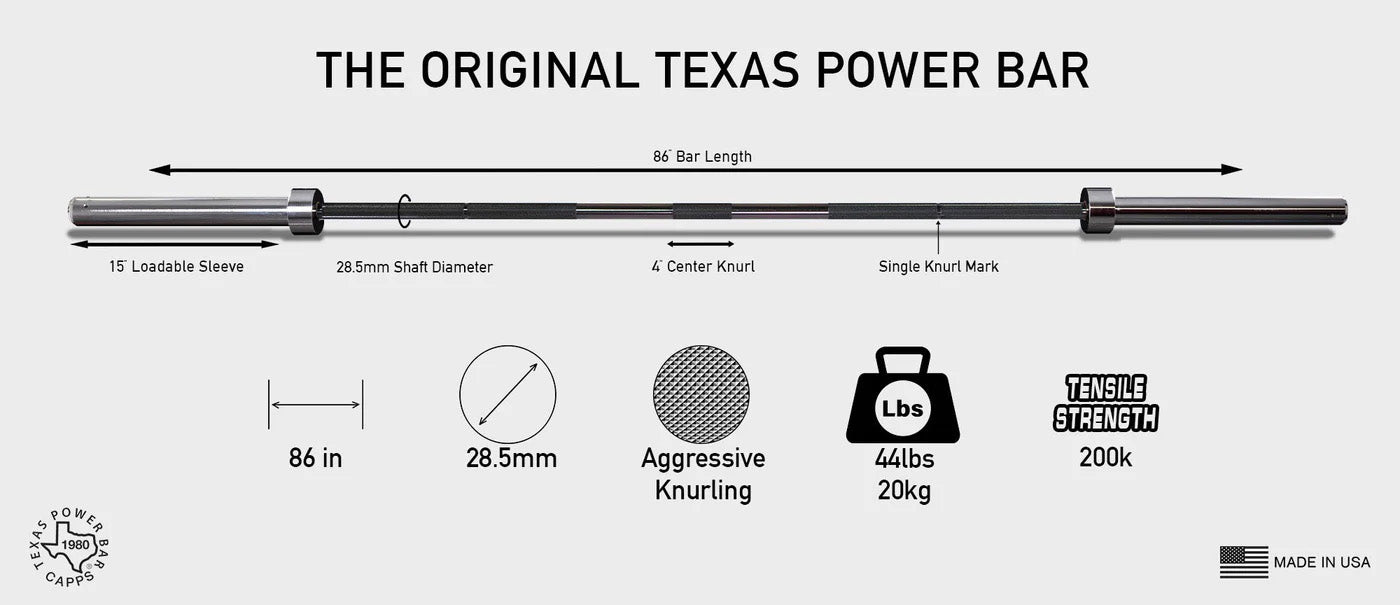 The Original Texas Power Bar - An all-around powerlifting bar for squat, bench, deadlift and general gym use.