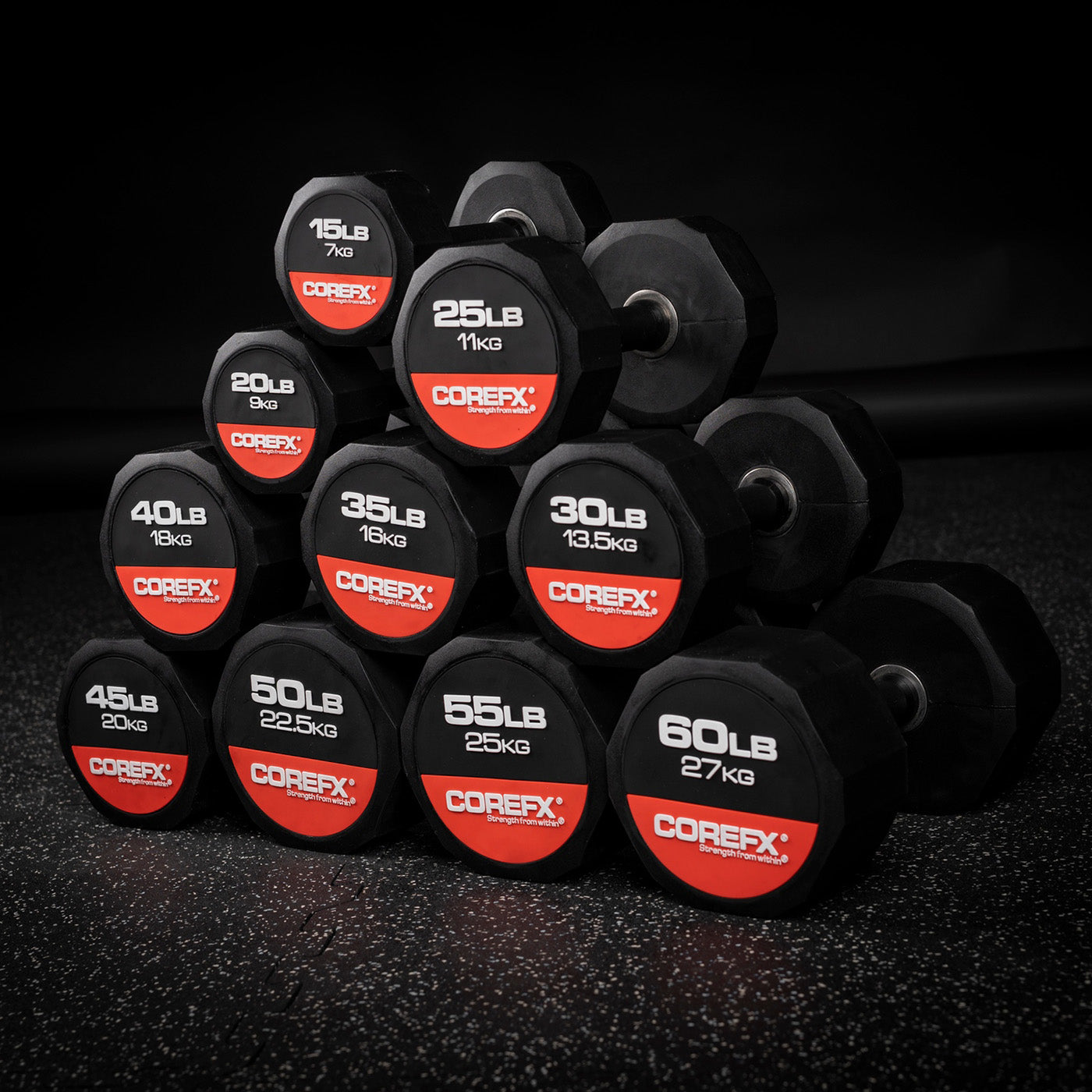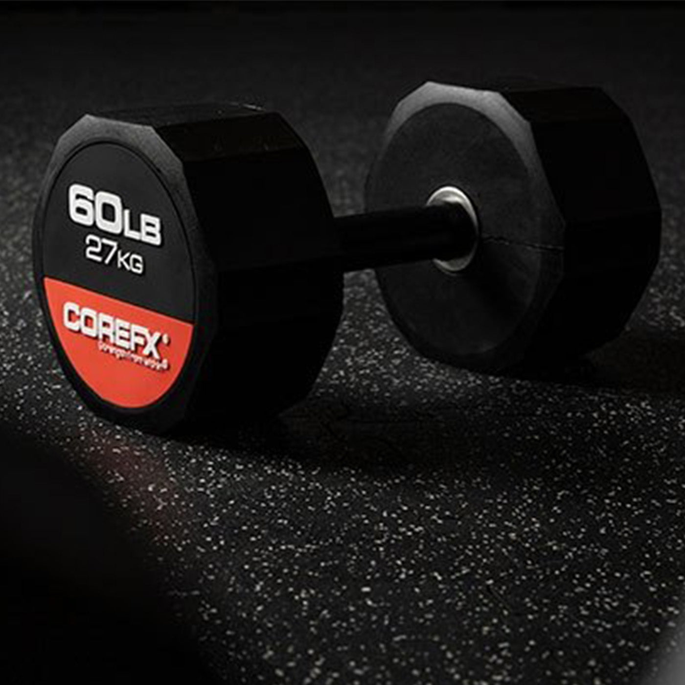 The COREFX Rubber Dumbbell features a unique 12-sided rubber coating to stop the weight from rolling and to help protect damage to your floors. Each precision-machined handle maintains the same length across various weights and its medium-grade knurling will ensure a safe grip during your lifts.