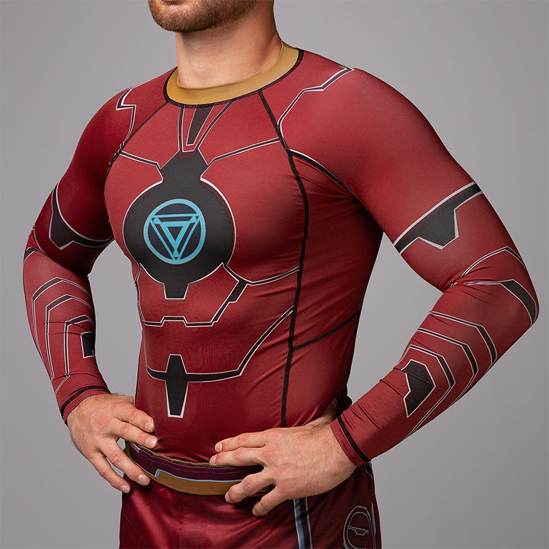 The Iron Man Long Sleeve Rash Guard conforms to your body and fits like a second skin. It's comfortable from the moment you put it on and helps keep your muscles warm and skin dry during strenuous training. Designed to reflect the mechanical components and vital arc reactor of classic Iron Man armor built by Tony Stark. Its breathable fabric protects your skin from mat burns and is locked in place by a silicone waistband.