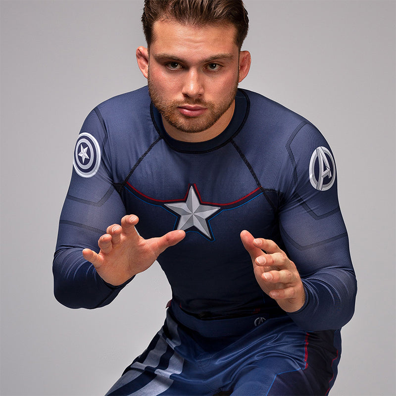 The Captain America Long Sleeve Rash Guard conforms to your body and fits like a second skin. It's comfortable from the moment you put it on and helps keep your muscles warm and skin dry during strenuous training. Designed to reflect Cap's patriotic armor and classic colors, this rash guard makes you feel like a super-soldier. Its breathable fabric protects your skin from mat burns and is locked in place by a silicone waistband.