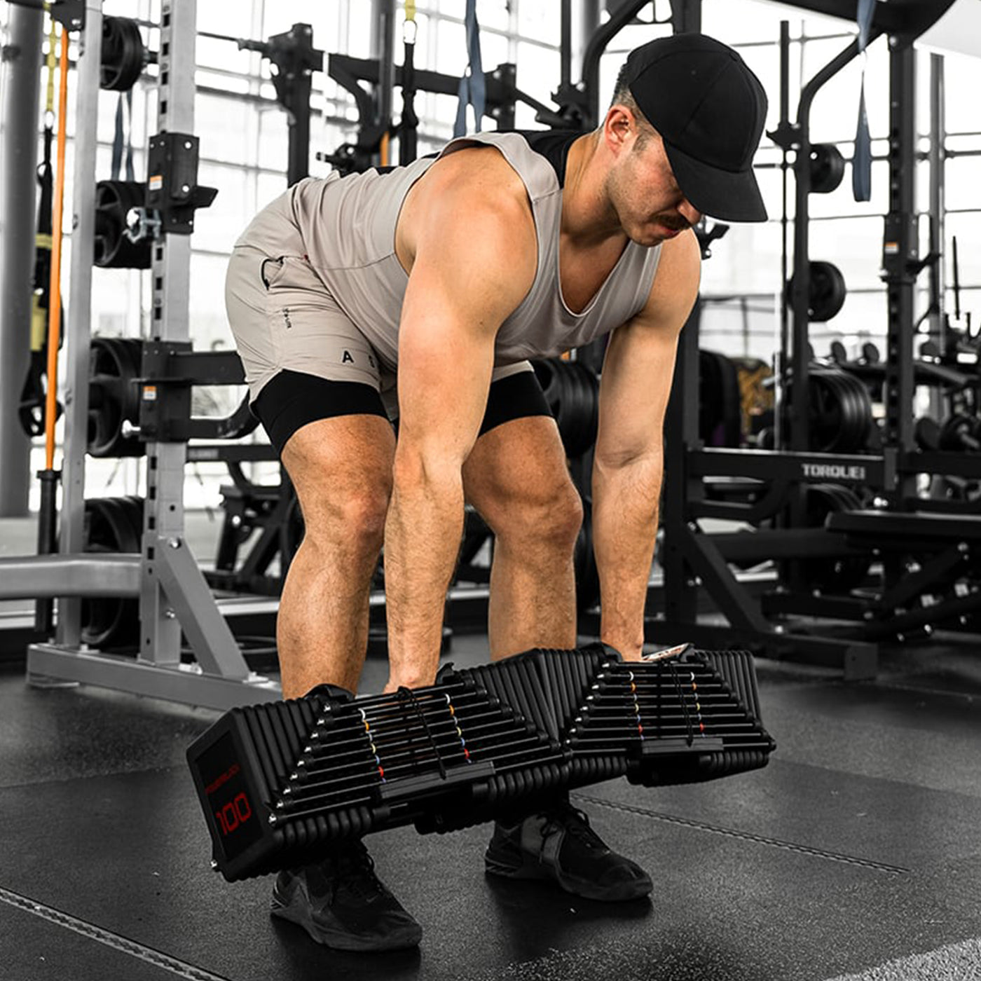 The PowerBlock Pro 100 adjustable dumbbells are at the top of the food chain for professional strength training equipment. With unmatched versatility you can replace 20 pairs of dumbbells with 1 set of PowerBlocks. That's 2,100Lbs of weight in less than 2 sqft., so it can easily be paired next to any power rack. The new handle has 50% more space and comes with the first knurled steel grip in the industry for added control and comfort. The modern aesthetics and sleek design complement any training environment and with optional custom decals anyone can upgrade to add their logos and colors. Professional equipment for achieving maximum results has never looked this good. Athletes of all ages and disciplines will be excited to take it to the next level knowing their equipment is designed for and used by the worlds best.