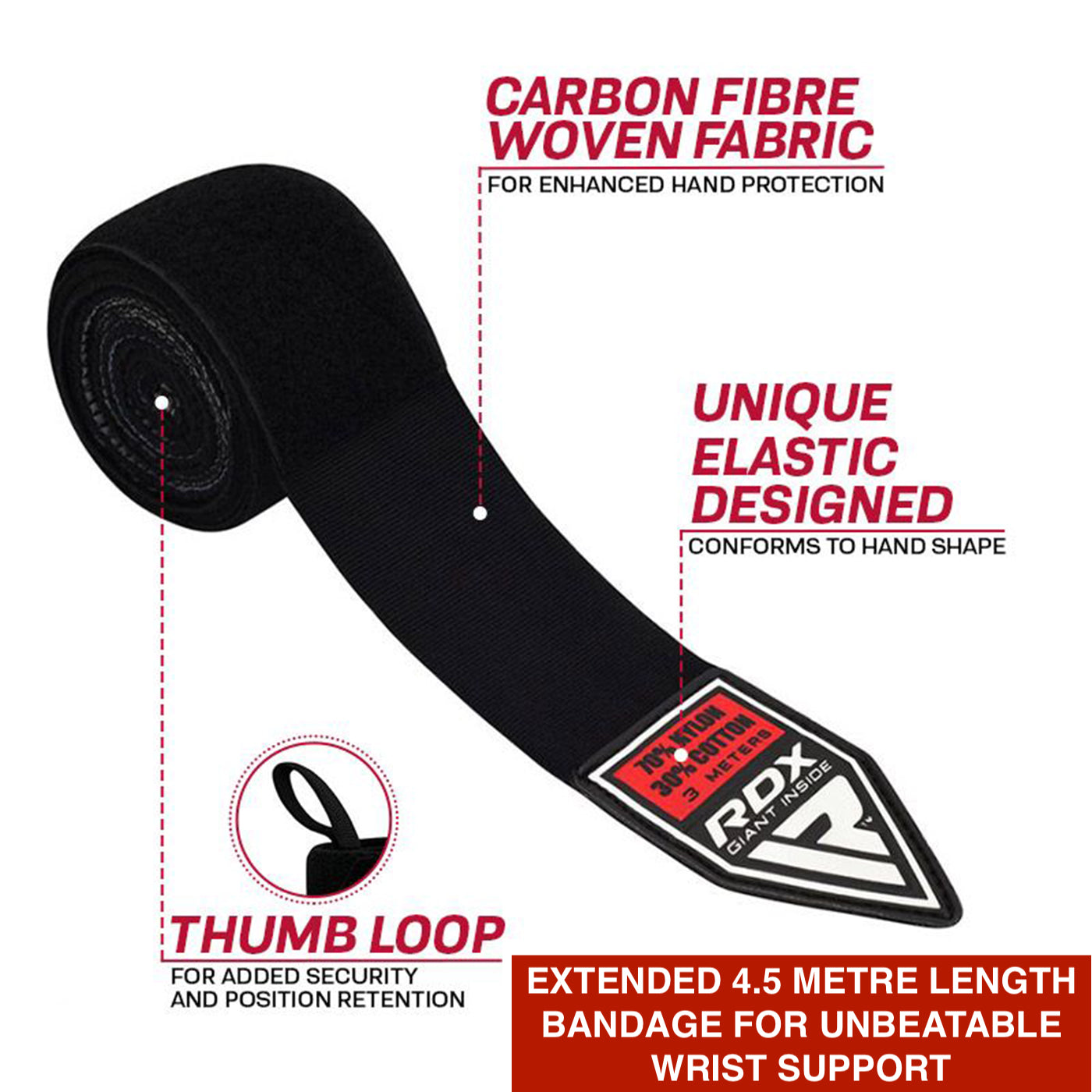 The WX Hand Wraps features a carbon fibre woven fabric provides maximum protection while the elastic design conforms to your hands. The quick-ez hook & loop helps you adjust the wraps quickly and easily for a secure fit. Make sure your hands are taken care of with RDX!