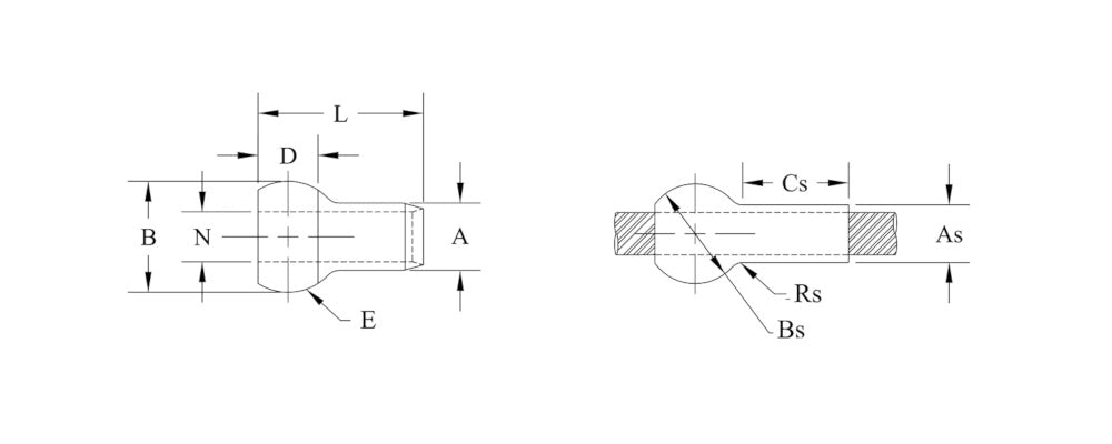 MS Part Number | Cable Dia. | A Dia. | As Dia. | B Dia. | Bs Spherical Dia. | Cs Ref | D Ref | E Rad Ref | L | N Dia. | Rs Rad Ref | Lbs. Per Piece |