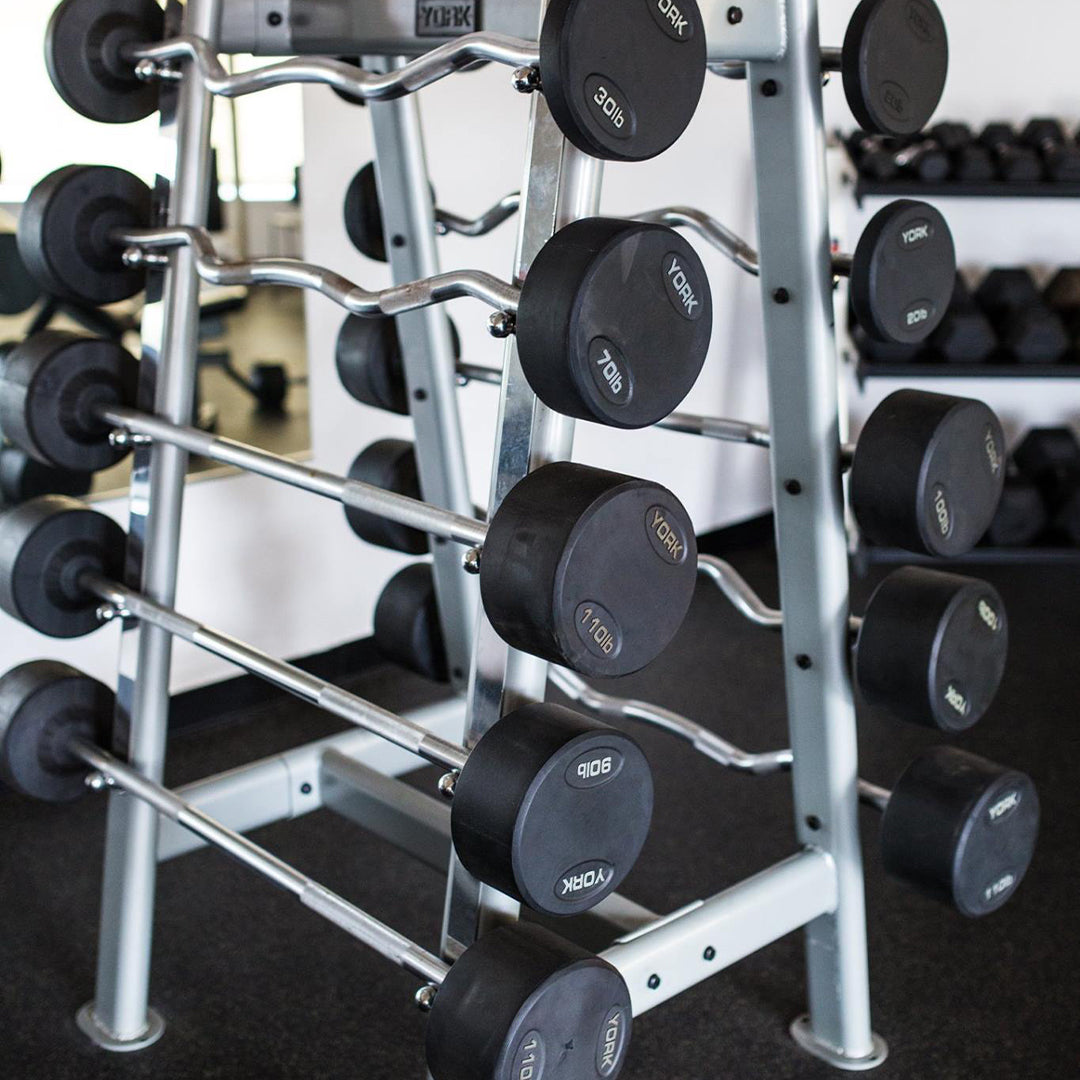 York adopted its Pro Style Barbell head design and applied it to our new Pro Style Fixed Straight and Curl Bars. The barbell heads are comprised of solid steel inserts fully encased in rubber. The solid steel handle passes through the steel insert and is welded permanently joining the head to the bar. Rubber coating increases durability, protects equipment, enhances appearance, diminishes noise, and is easy to clean.