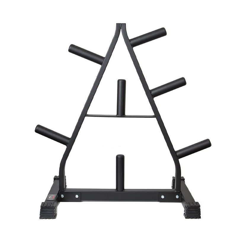 This Olympic A – Frame Plate Tree keeps 2” Olympic weights up off the floor, preventing tripping hazards and allowing for easy plate changes. It features five external plate storage pegs as well as two storage pegs in the center for smaller plates.