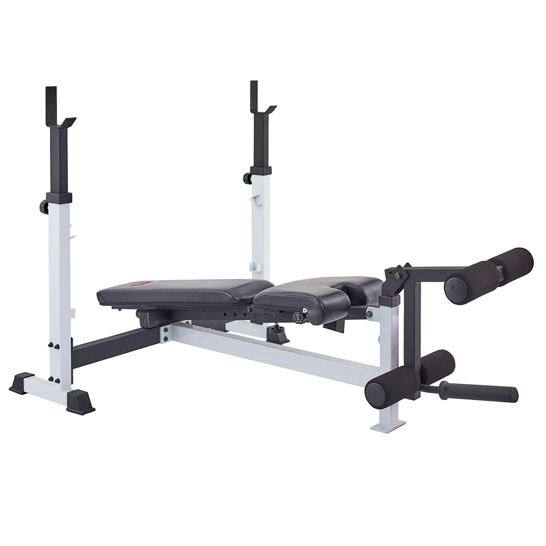 This bench adjusts from flat to decline, incline, and up to 90 degrees of intensity, with telescoping uprights extending from 33 1/2" to a lofty 49"! Experience a full range of exercise possibilities with the included leg developer and adjustable back pad. It's an unbeatable combination for any fitness enthusiast.